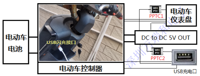 PPTC1在电动自行车仪表电路的电源输入端,针对仪表电路和电源转换电路的过载和短路保护,当仪表盘有短路或过载时会产生很大的拉电流、或电源转换电路故障可能产生高压大电流灌入仪表电路,两种大电流经过PPTC1,会使PPTC1从正常工作的mΩ级低电阻,突变到KΩ或MΩ级高电阻而限制电流,从而达到状态,以保护整个设备电路系统不至于大电流烧线起火,当断电、故障消失、或大电流消失后, PPTC1会从KΩ或MΩ级高阻态恢复到正常工作的mΩ级低阻态继续工作;同样,PPTC2针对USB接口短路大电流和电源转换电路高压灌电流的限流保护。这里的PPTC1和PPTC2都是可重复使用千次而无需更换的,所以叫自恢复保险丝,其电阻值突变过程是及时提前的,这是其高可靠的原因,PPTC1和PPTC2是正温度系数的热敏电阻,在温度、电流不变时,一直稳定工作还不受脉冲干扰。而且其失效模式又是高电阻态,所以其失效和损坏状态也是保护状态。可见采用PPTC1和PPTC2做电动自行车的保护方案的可靠性高、成本低、寿命长。