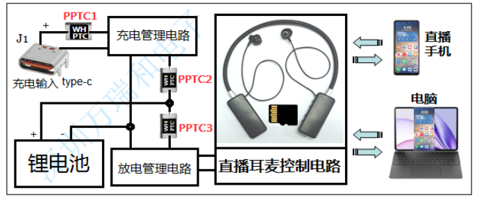 PPTC在专业直播耳麦的保护应用中,主要应用于充电接口、锂电池输入输出端、及相关电路的过载、短路的限流保护,装联位置如图所示。