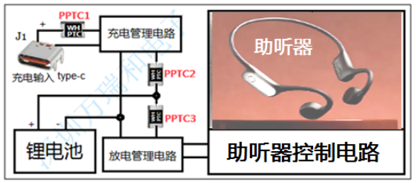 图中PPTC1是针对充电管理电路有短路大电流故障出现时、以及输入端误输入快充高电压产生大电流时,PPTC1会因大电流的发热而由低电阻突变到高电阻,从而限流,既保护该充电管理电路,同时也保护了充电器电源电路;PPTC2与PPTC3都是针对锂电池的保护,同时也保护了包括充放电管理电路的整个电路系统。其中PPTC2主要针对充电管理电路有短路大电流时,及时突变到高阻态,以避免因短路从锂电池抽出大电流而导致锂电池发热爆炸,而PPTC2的限流,在保护锂电池的同时也保护了充电管理电路;PPTC3是针对负载放电管理电路和助听器系统电路的,当助听器电路有短路大电流时,这个大电流是从锂电池经过放电管理电路而取得的,所以这个大电流同时也经过了PPTC3,这时的PPTC3会由正常工作的低电阻跳变到高电阻,能及时限流,以避免长时间大电流使锂电池发热爆炸而产生伤人事件。