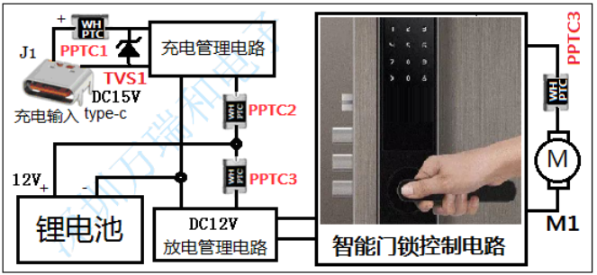 在众多的过载保护方法中,我们推荐应用 PPTC(高正温度系数热敏电阻)又叫自恢复保险丝或自复位过流保护器,完成该系统电路的过载保护和短路、堵转保护,是一个高性价比的防护方案,PPTC是一种自限温器件,在大电流和高温升双重作用下,能够快速的动作从低阻态突变为高阻态,及时限制电路的电流而保护设备系统。并保持这种保护状态,在断电或故障消失后才会由高阻状态恢复为低阻状态,可有效避免上述物联网LOT智能门锁可能出现的和潜在的各种问题和安全隐患。